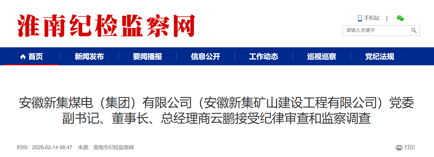 安徽新集煤电(集团)有限公司(安徽新集矿山建设工程有限公司)党委副书记、董事长、总经理商云鹏涉嫌严重违纪违法,经淮南市纪委监委指定管辖,目前正接受淮南市八公山区纪委监委纪律审查和监察调查。(淮南市八公山区纪委监委)