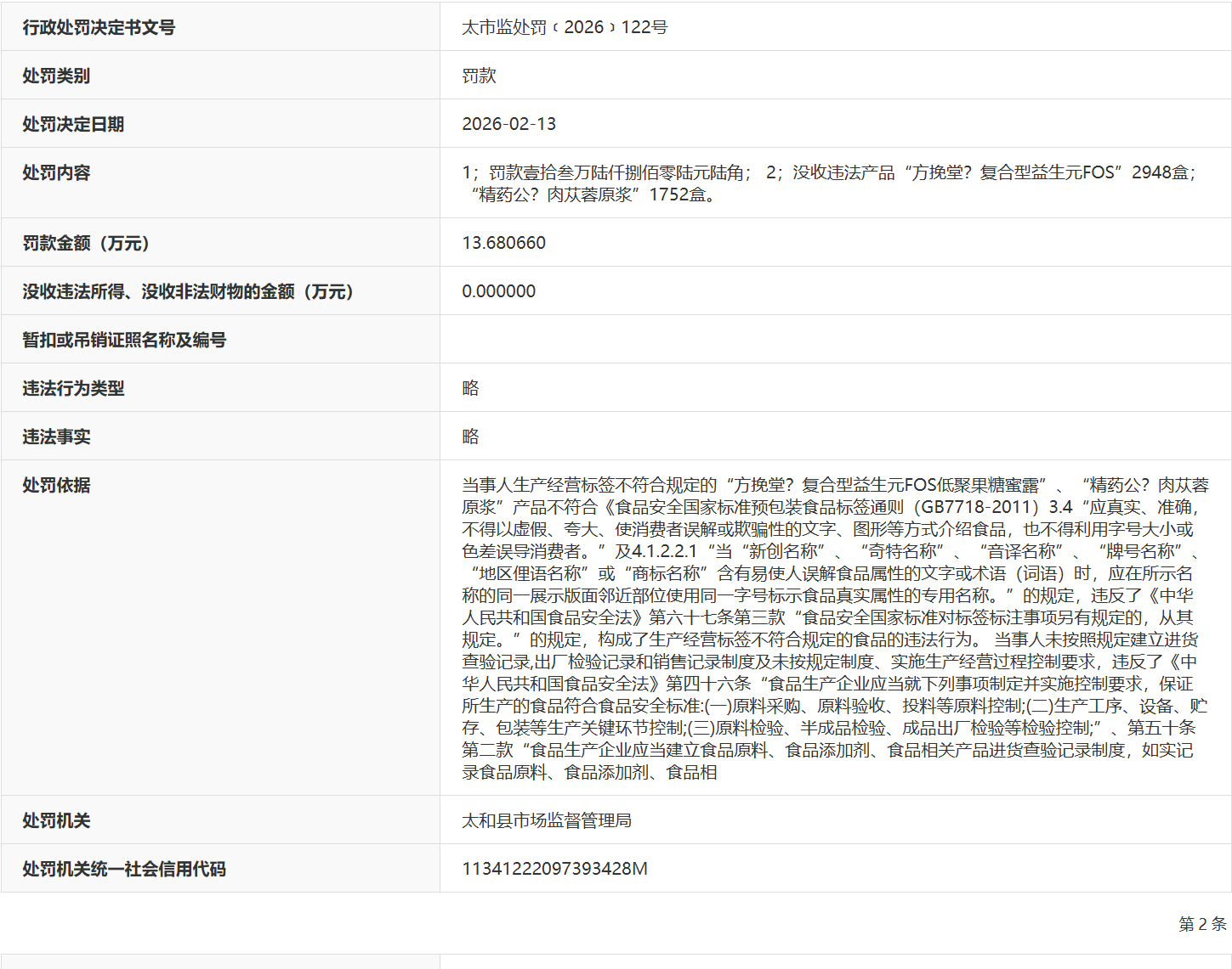 近日,据“信用安徽”公开披露行政处罚信息,因生产经营标签不符合规定,未按照规定建立进货查验记录、出厂检验记录和销售记录制度及未按规定制度、实施生产经营过程控制要求,安徽达维康健康科技有限公司被处以罚款13.68066万元。行政处罚决定书文号是太市监处罚﹝2026﹞122号。