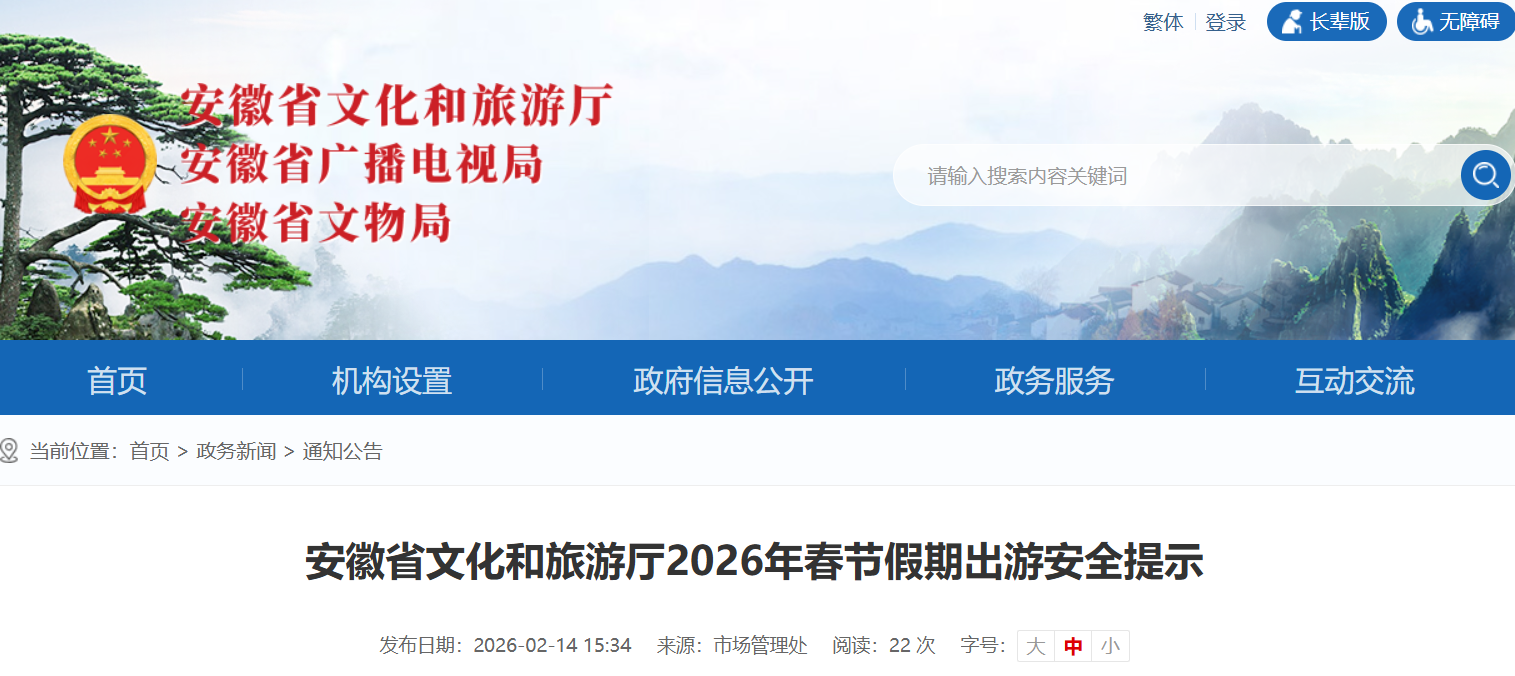 2月14日,安徽省文旅厅发布2026年春节假期出游安全提示,详情如下: