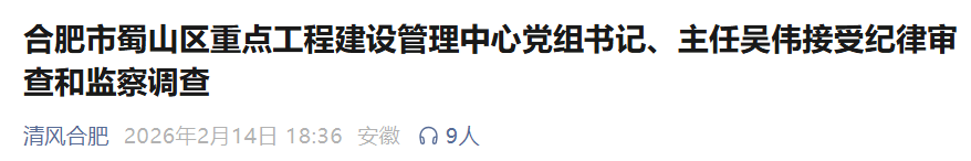 合肥市蜀山区重点工程建设管理中心党组书记、主任吴伟涉嫌严重违纪违法,主动投案,目前正接受合肥市蜀山区纪委监委纪律审查和监察调查。(合肥市蜀山区纪委监委)