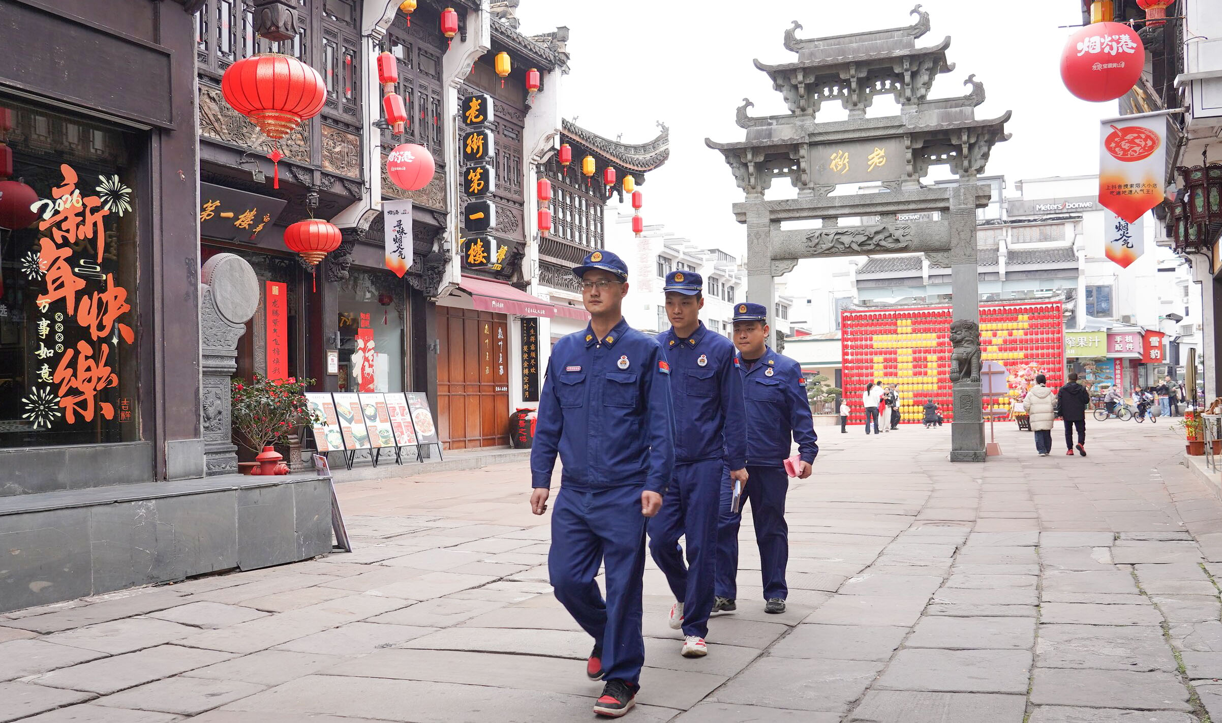 屯溪区政府老街专职消防队副队长刘绍军介绍:“老街是国家级历史文化街区,建筑多为木质结构,防火容不得半点闪失。春节期间,我们实行24小时战备巡逻,全员在岗、枕戈待旦,确保一旦有险情,1分钟内出动、3分钟到场处置。”