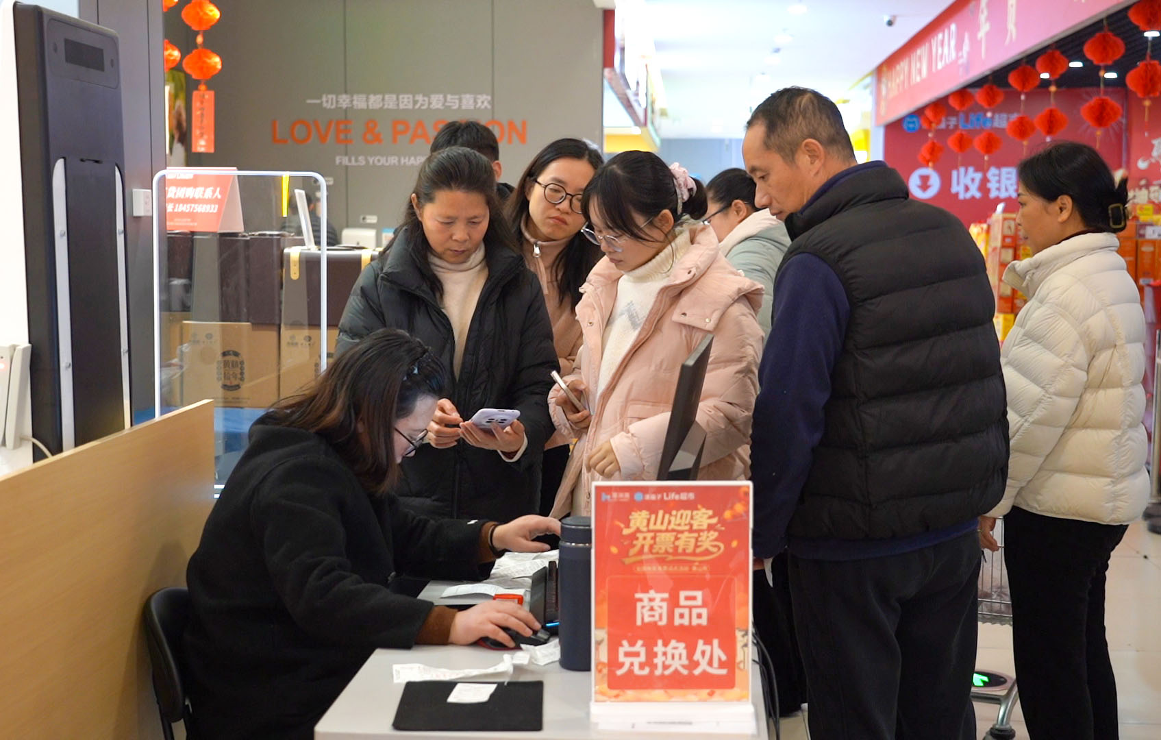 2月14日上午,在屯溪区汤猫子Life超市天盈店内,年货采购高峰与“有奖发票”政策红利叠加,收银台前排起了长队。不少顾客一边扫码付款,一边笑着提醒收银员:“别忘了给我开发票啊!”