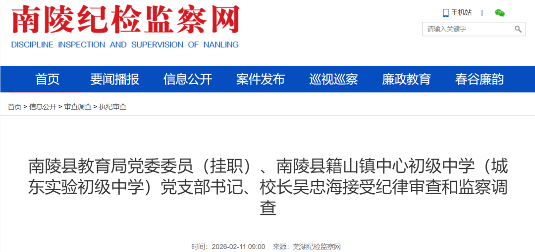 据南陵纪检监察网2月11日消息,南陵县教育局党委委员(挂职)、南陵县籍山镇中心初级中学(城东实验初级中学)党支部书记、校长吴忠海涉嫌严重违纪违法,目前正接受南陵县纪委监委纪律审查和监察调查。(南陵县纪委监委)