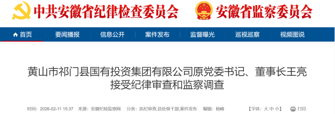 据安徽纪检监察网2月11日消息,黄山市祁门县国有投资集团有限公司原党委书记、董事长王亮涉嫌严重违纪违法,目前正接受祁门县纪委监委纪律审查和监察调查。(祁门县纪委监委)