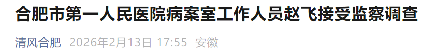 据清风合肥微信公众号2月13日消息,合肥市第一人民医院病案室工作人员赵飞涉嫌严重违法,目前正接受长丰县监察委员会监察调查。(长丰县纪委监委)