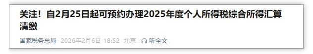 通告明确,2025年度个人所得税综合所得汇算清缴办理时间为2026年3月1日至6月30日,税务部门将为纳税人提供预约办理服务。