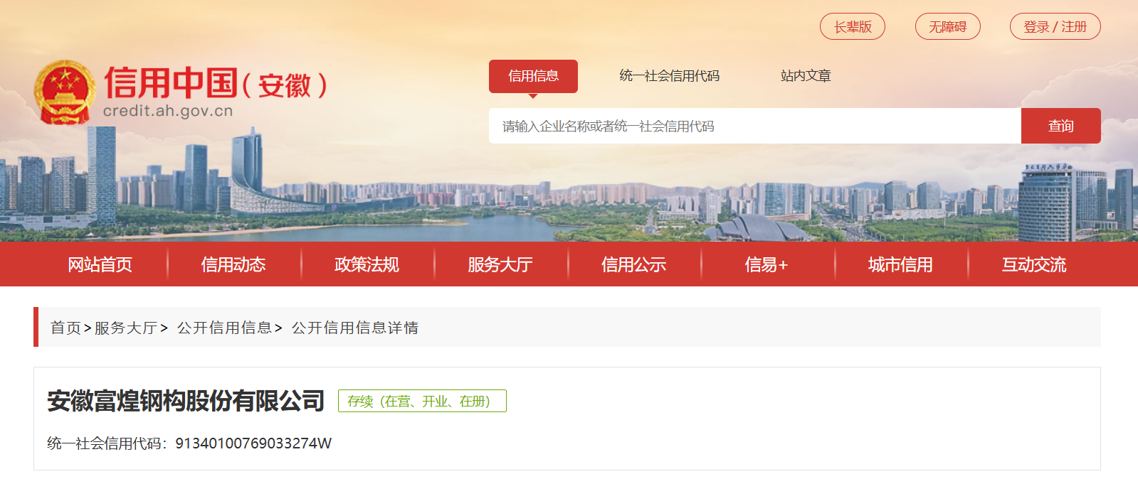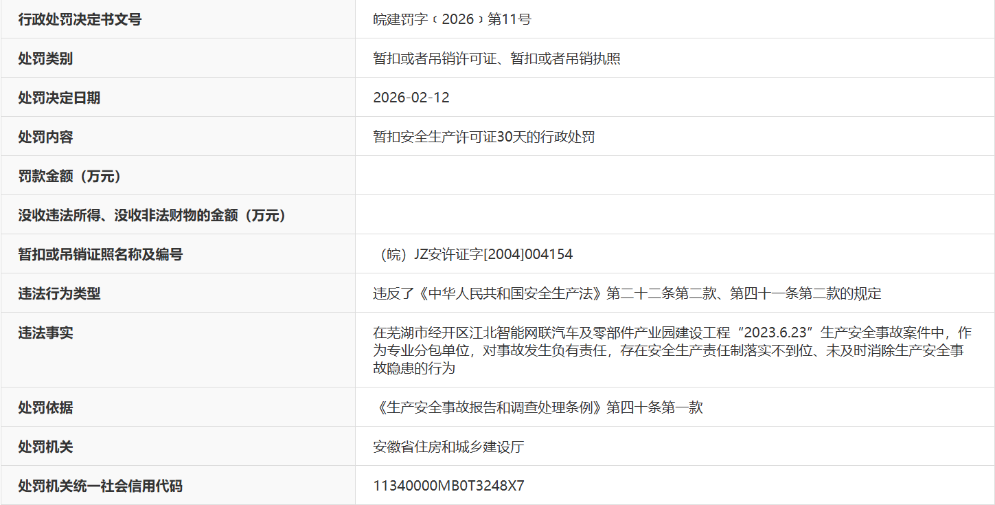 近日,据“信用安徽”公开披露行政处罚信息,因存在安全生产责任制落实不到位、未及时消除生产安全事故隐患的行为,安徽富煌钢构股份有限公司被处以暂扣安全生产许可证30天的行政处罚。行政处罚决定书文号是皖建罚字﹝2026﹞第11号。