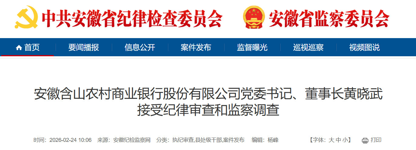 安徽含山农村商业银行股份有限公司党委书记、董事长黄晓武涉嫌严重违纪违法,目前正接受安徽省纪委监委驻省农信社纪检监察组纪律审查;经安徽省监委指定管辖,接受铜陵市铜官区监察委员会监察调查。(安徽省纪委监委驻省农信社纪检监察组、铜陵市铜官区纪委监委)