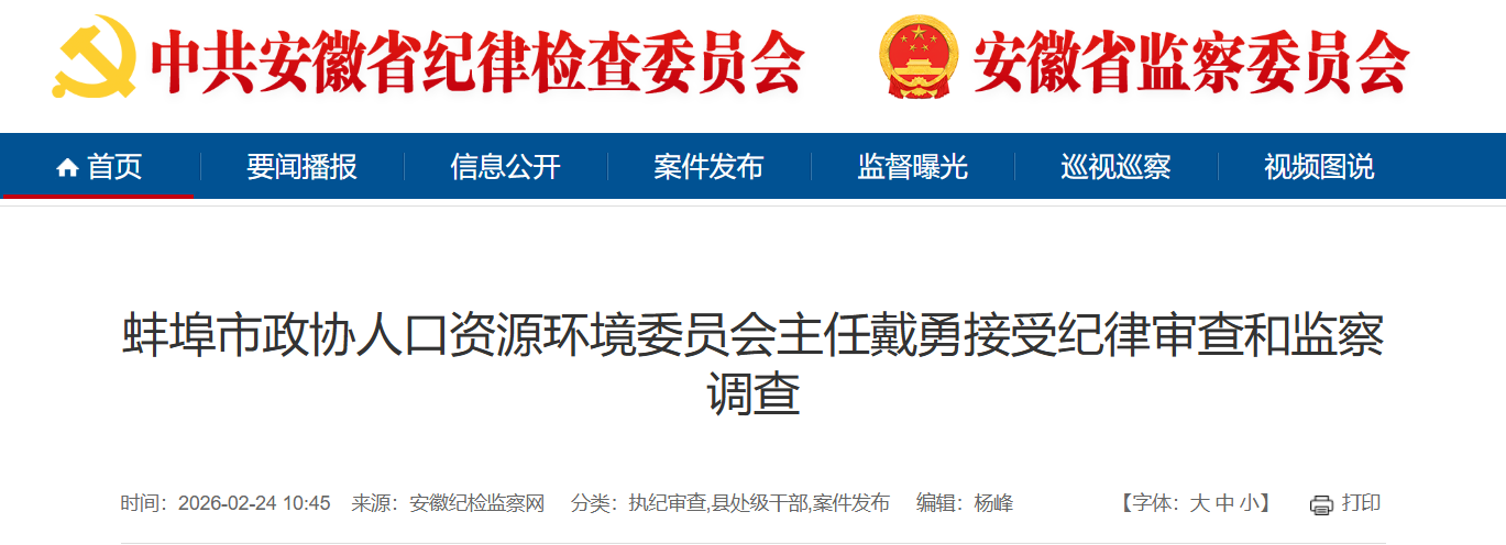 蚌埠市政协人口资源环境委员会主任戴勇涉嫌严重违纪违法,目前正接受蚌埠市纪委监委纪律审查和监察调查。(蚌埠市纪委监委)