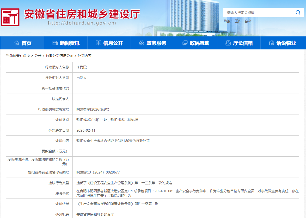 专业分包单位专职安全员李肖霞,对事故发生负有责任,存在未及时消除生产安全事故隐患的行为,被暂扣安全生产考核合格证书C证180天,行政处罚决定书文号是皖建罚字[2026]第9号。
