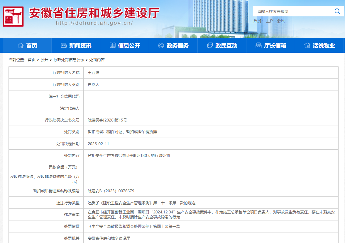 施工总承包单位项目负责人王业波,对事故发生负有责任,存在未落实安全生产管理责任、未及时消除生产安全事故隐患的行为,被暂扣安全生产考核合格证书B证180天,行政处罚决定书文号是皖建罚字[2026]第15号。