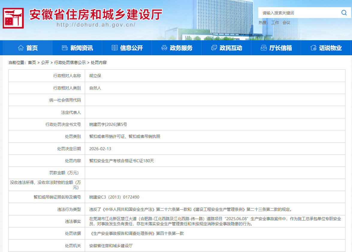 施工总承包单位专职安全员胡立保,对事故发生负有责任,存在未落实安全生产管理责任和未按规定消除安全事故隐患的行为,被暂扣安全生产考核合格证书C证180天。行政处罚决定书文号是皖建罚字[2026]第5号。
