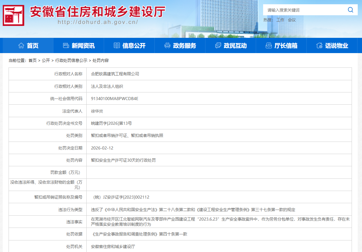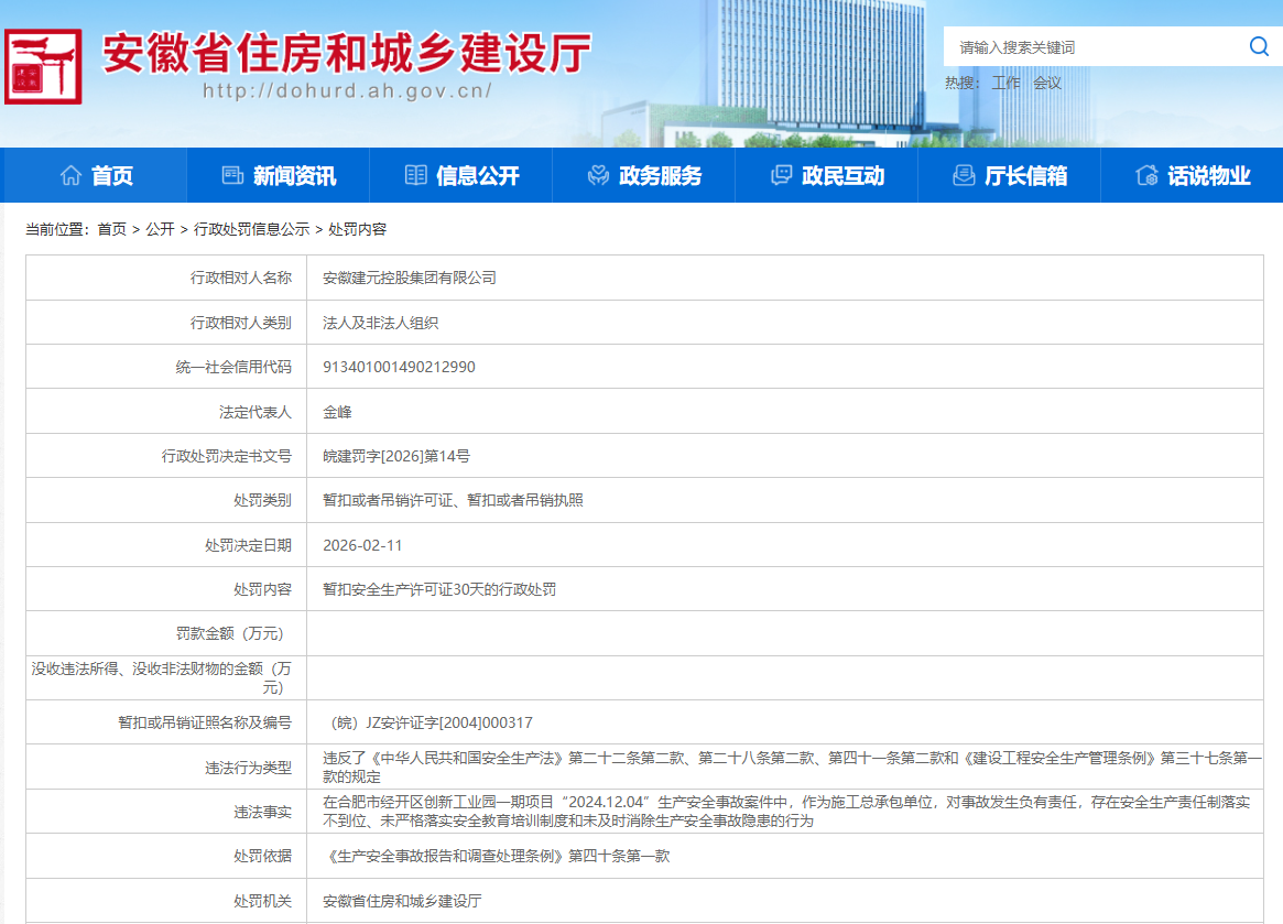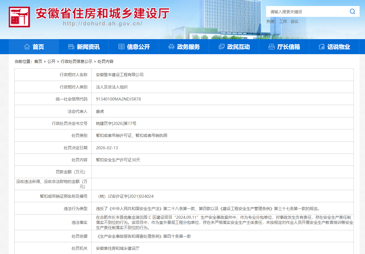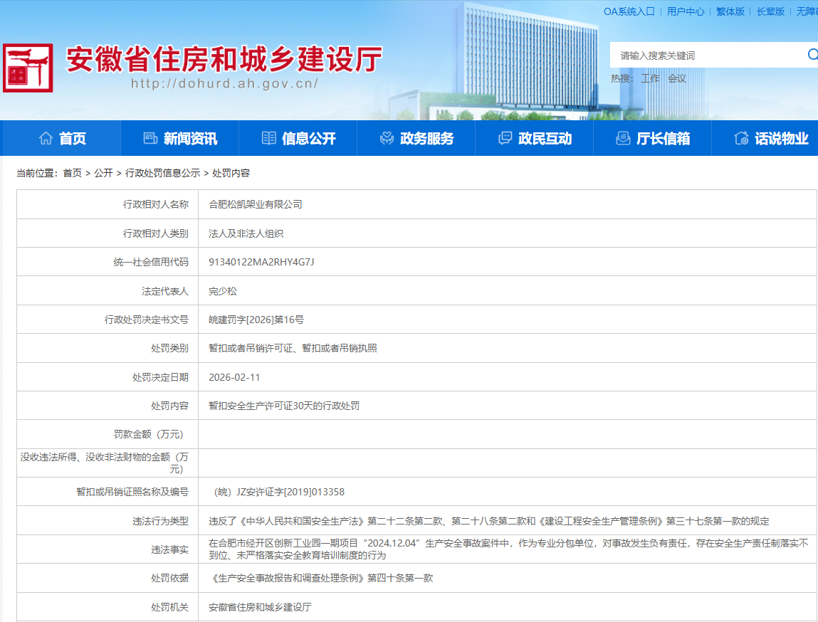 这三家企业均被处以暂扣安全生产许可证30天的行政处罚。行政处罚决定书文号分别是是皖建罚字[2026]第11号、皖建罚字[2026]第13号、皖建罚字[2026]第10号。