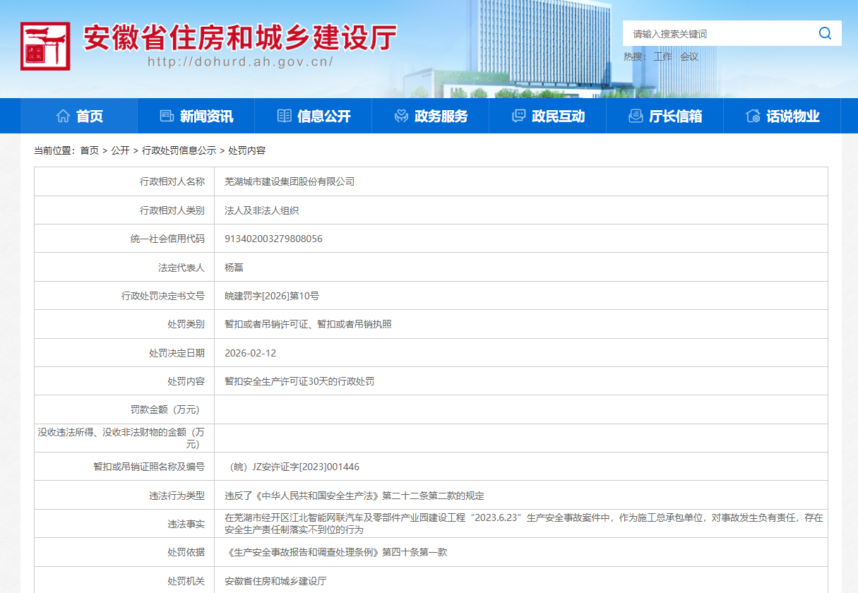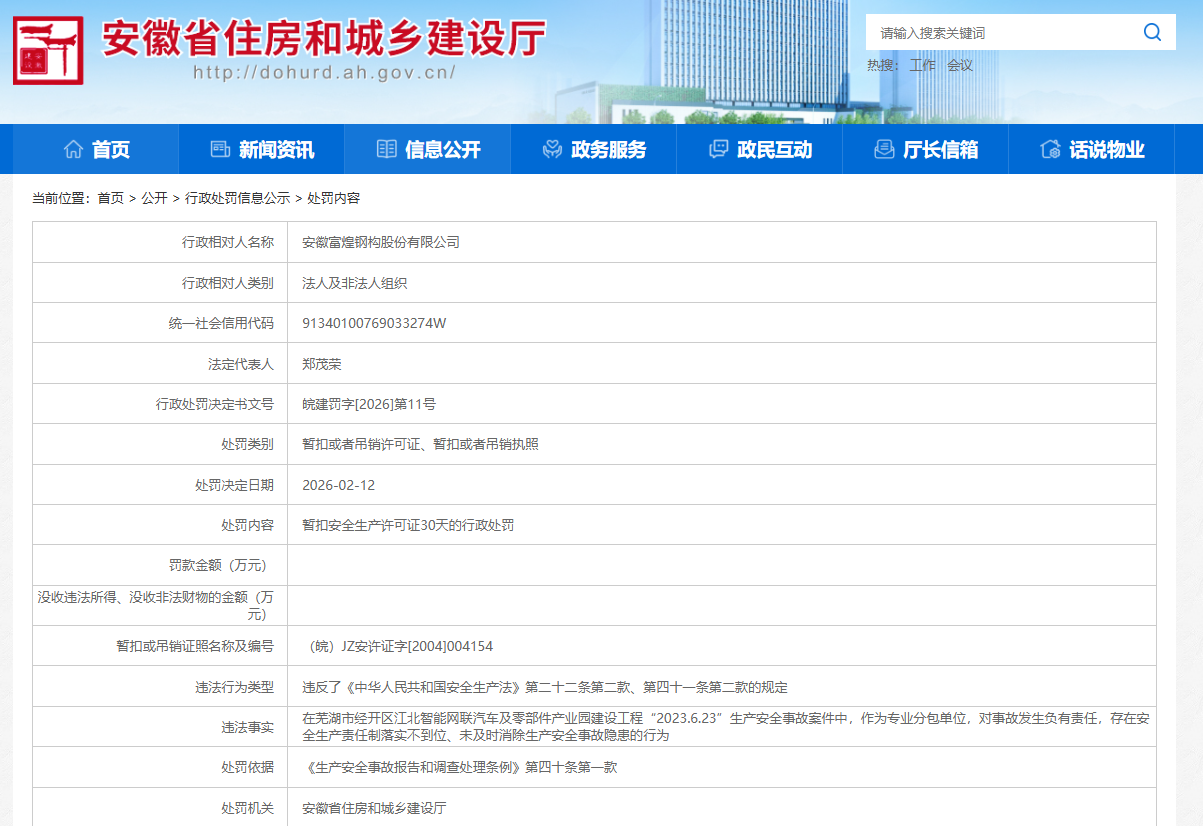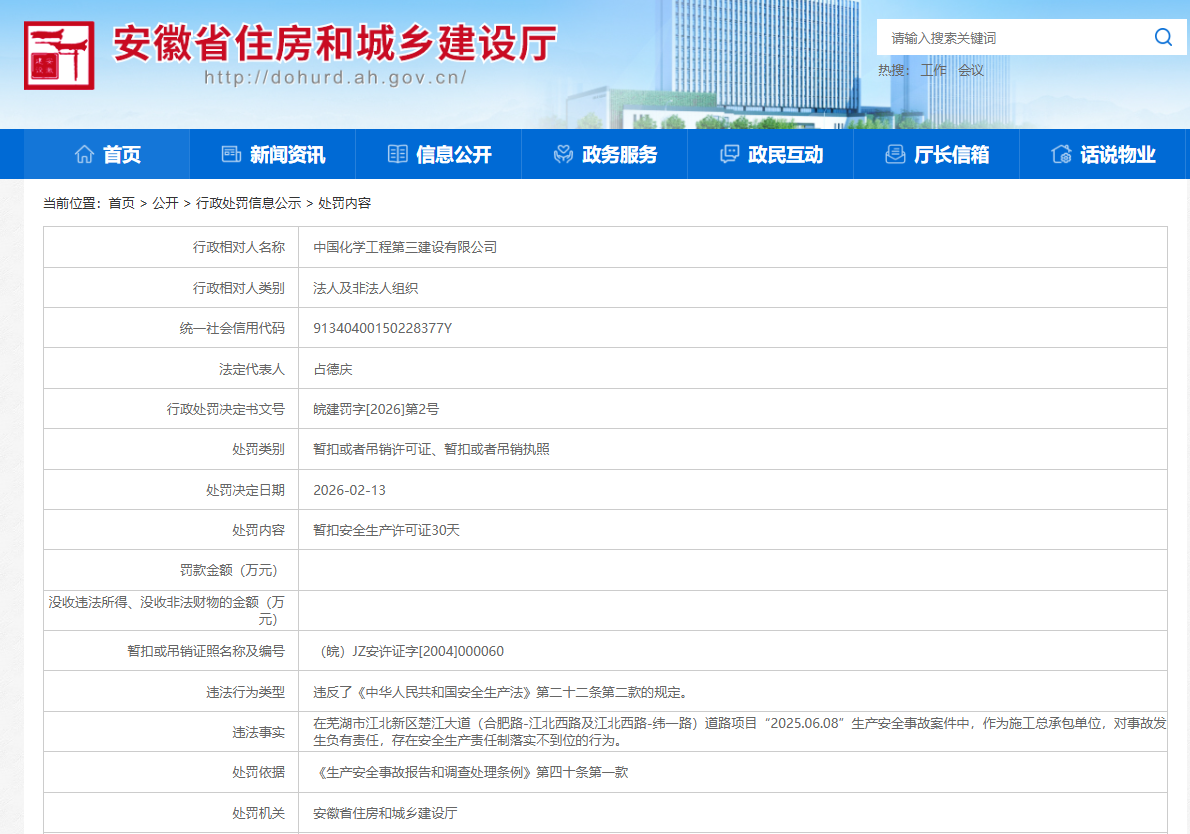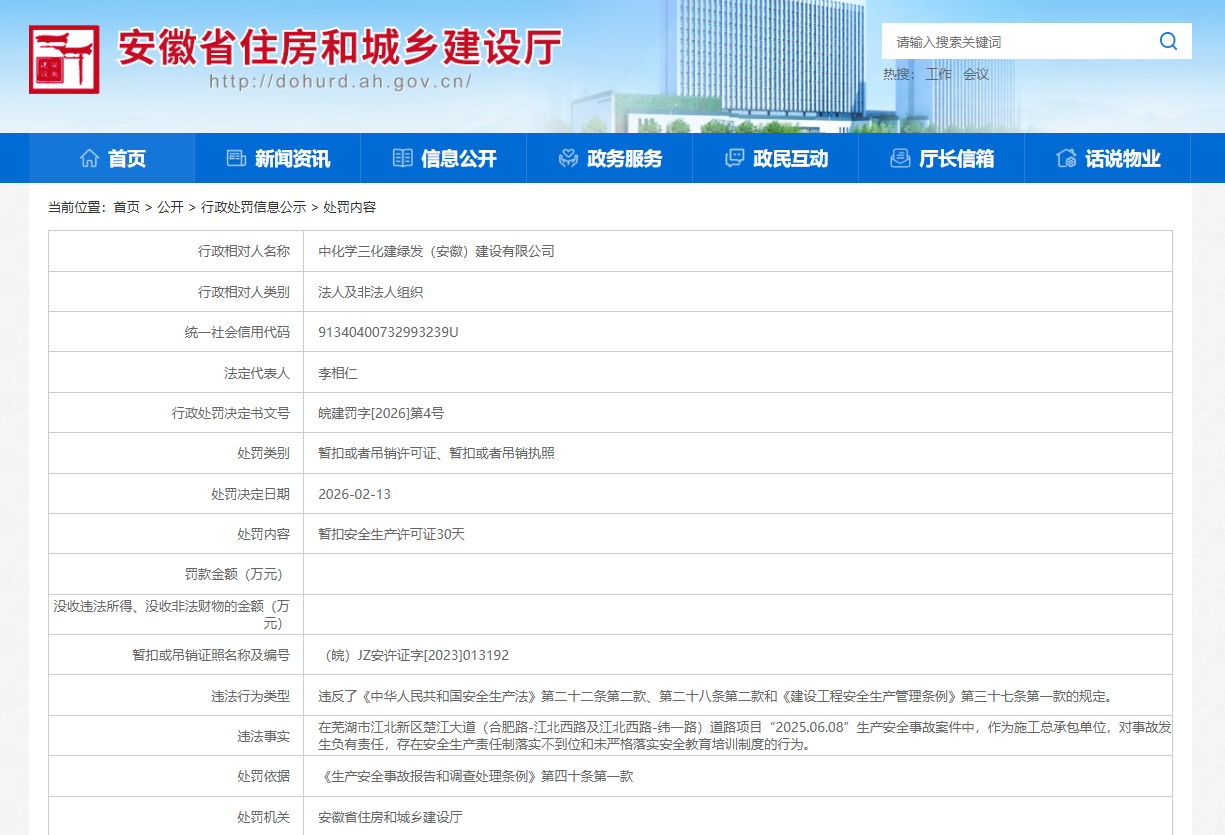 这三家企业均被处以暂扣安全生产许可证30天的行政处罚。行政处罚决定书文号分别是是皖建罚字[2026]第11号、皖建罚字[2026]第13号、皖建罚字[2026]第10号。
