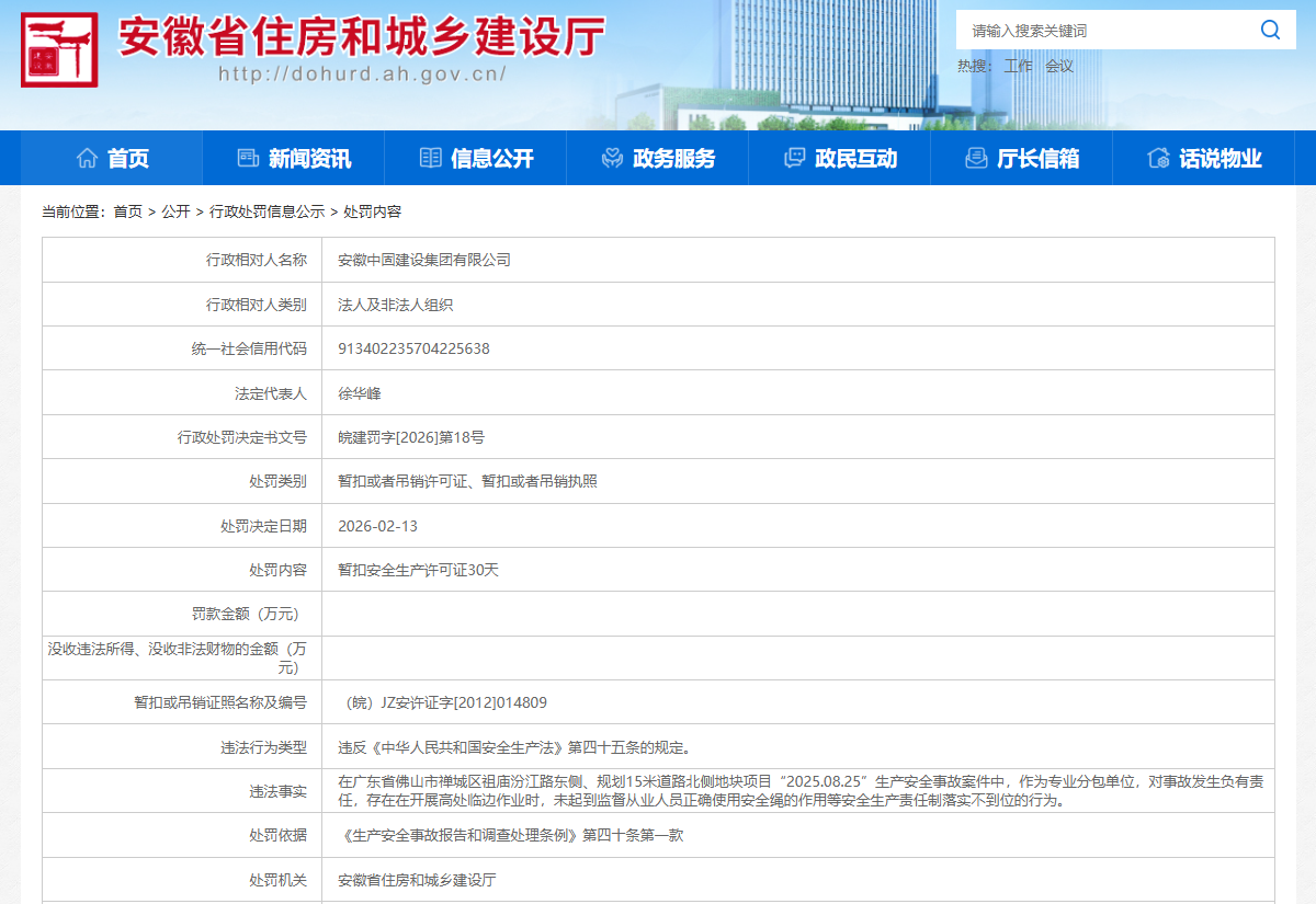 在广东省佛山市禅城区祖庙汾江路东侧、规划15米道路北侧地块项目“2025.08.25”生产安全事故案件中,安徽中固建设集团有限公司作为专业分包单位,对事故发生负有责任,存在在开展高处临边作业时,未起到监督从业人员正确使用安全绳的作用等安全生产责任制落实不到位的行为。该公司被暂扣安全生产许可证30天,行政处罚决定书文号是皖建罚字[2026]第18号。