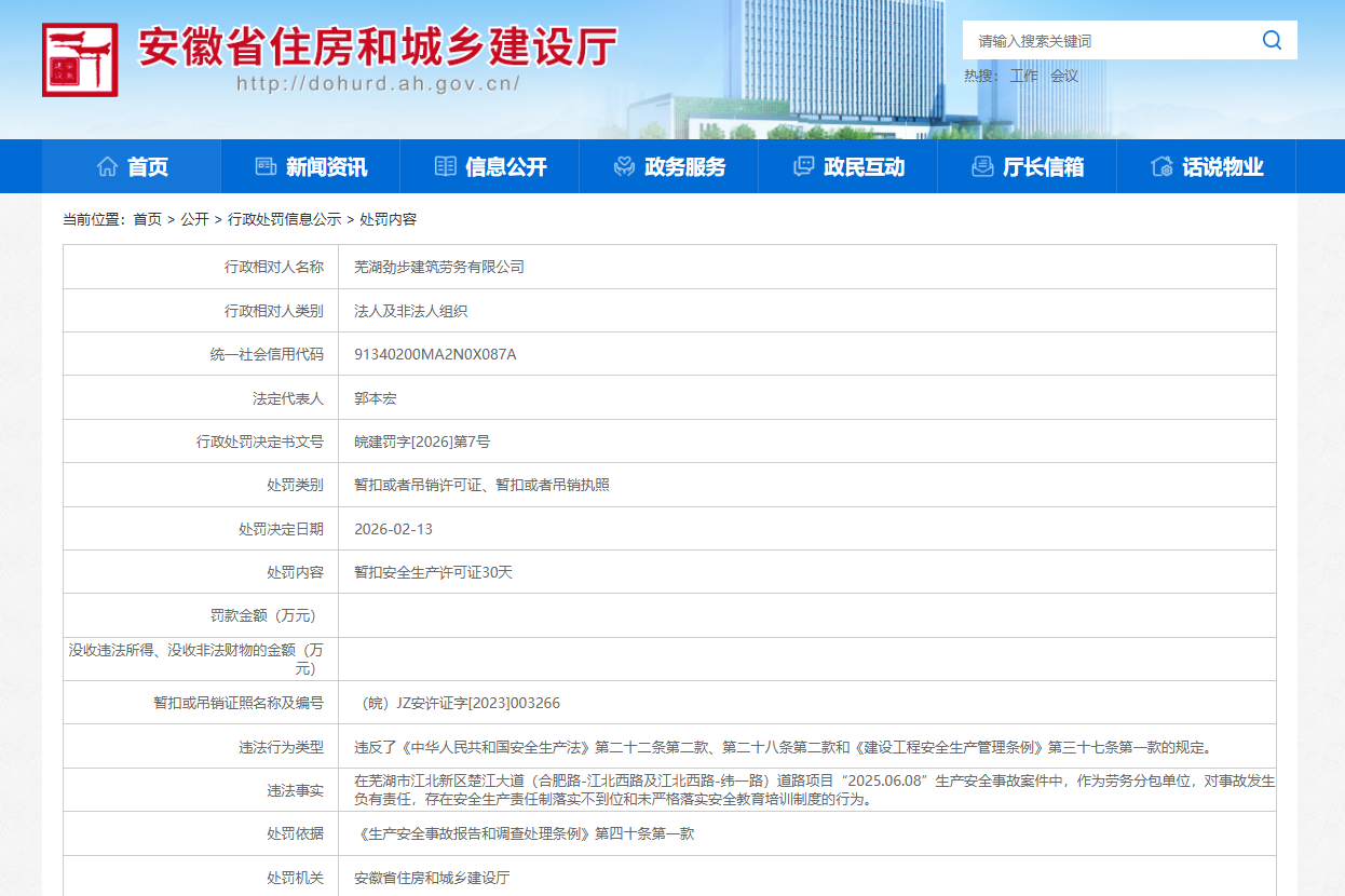 这三家企业均被处以暂扣安全生产许可证30天的行政处罚,行政处罚决定书文号分别是皖建罚字[2026]第2号、皖建罚字[2026]第4号、皖建罚字[2026]第7号。