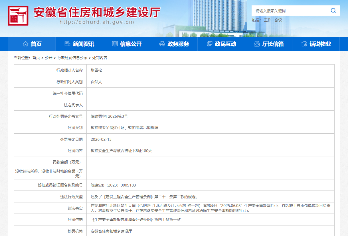 施工总承包单位项目负责人张雪松,对事故发生负有责任,存在未落实安全生产管理责任和未及时消除生产安全事故隐患的行为,被暂扣安全生产考核合格证书B证180天。行政处罚决定书文号是皖建罚字[2026]第3号。