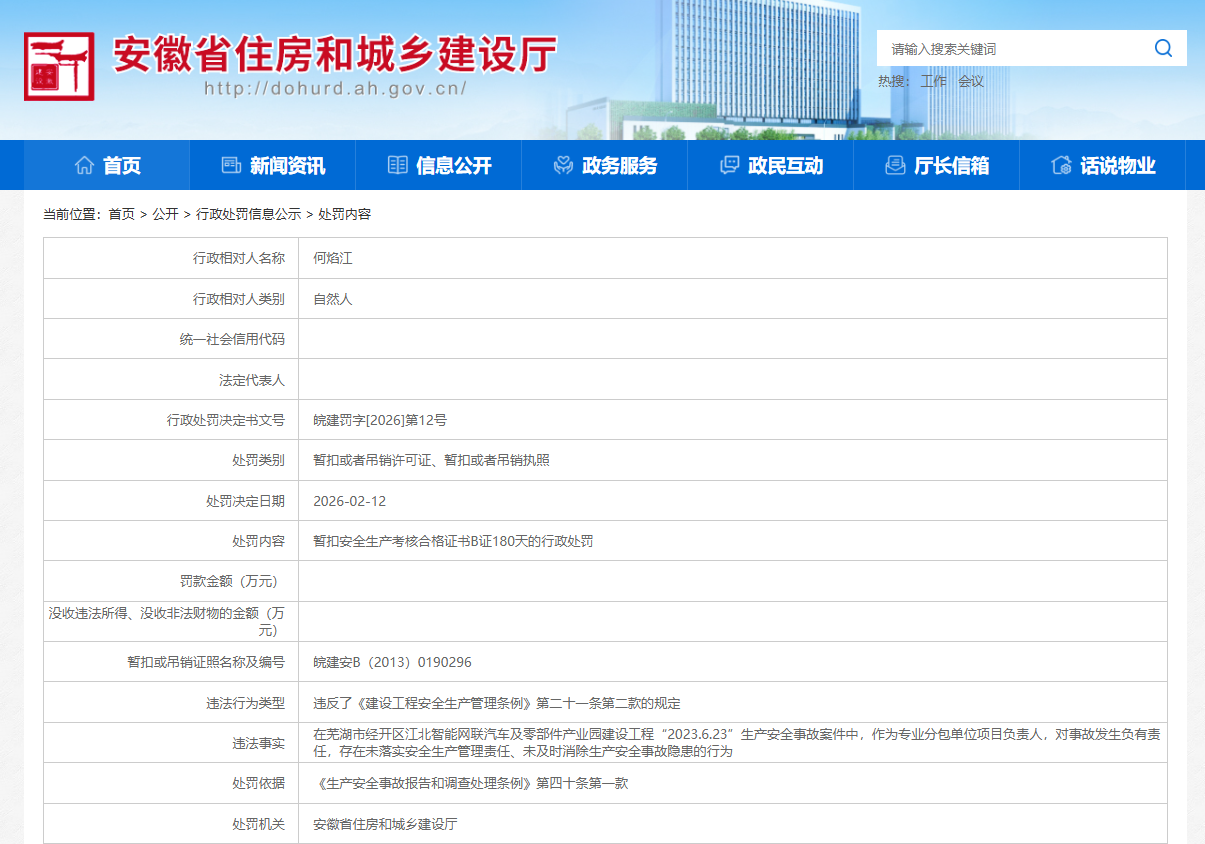 专业分包单位项目负责人何焰江,对事故发生负有责任,存在未落实安全生产管理责任、未及时消除生产安全事故隐患的行为,被暂扣安全生产考核合格证书B证180天。行政处罚决定书文号是皖建罚字[2026]第12号。