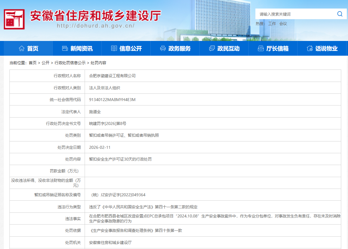 在合肥市肥西县老城区改造安置点EPC总承包项目“2024.10.08”生产安全事故案件中,合肥京瓷建设工程有限公司作为专业分包单位,对事故发生负有责任,存在未及时消除生产安全事故隐患的行为,被处以暂扣安全生产许可证30天的行政处罚。行政处罚决定书文号是皖建罚字[2026]第8号。