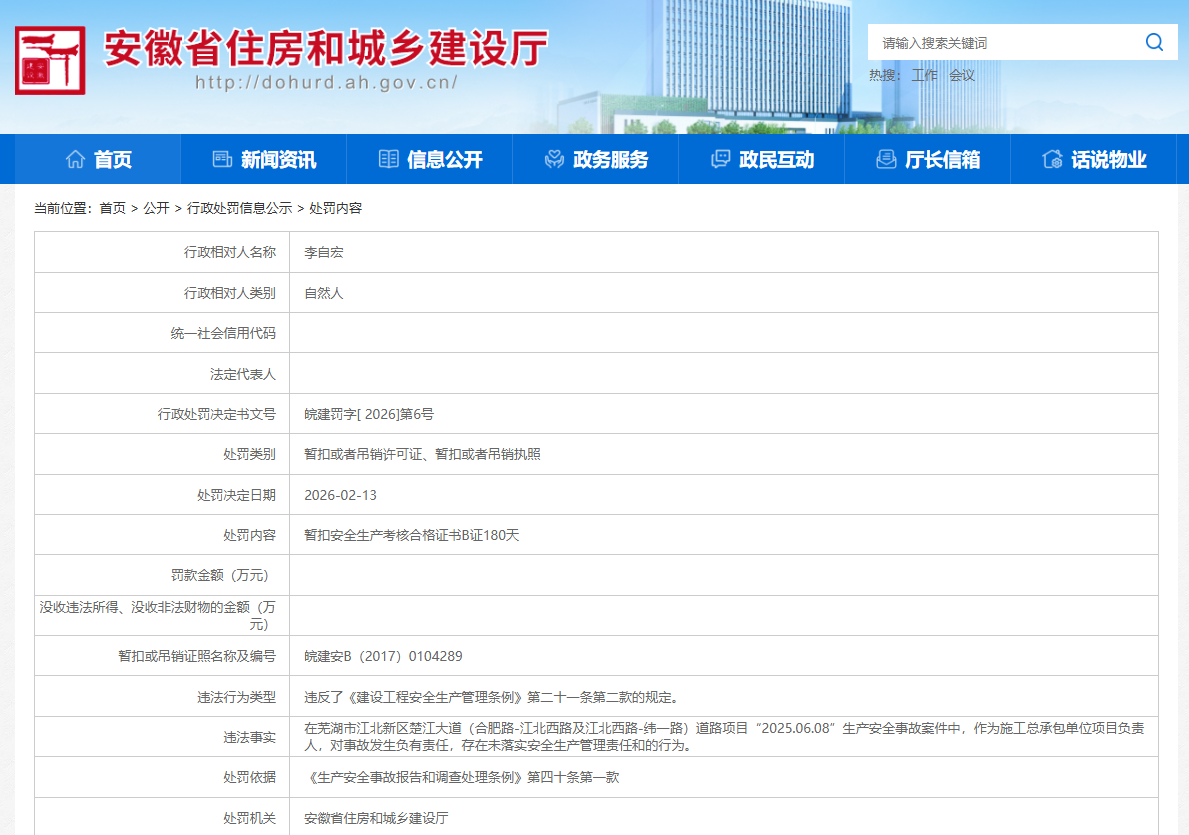 施工总承包单位项目负责人李自宏,对事故发生负有责任,存在未落实安全生产管理责任和的行为,被暂扣安全生产考核合格证书B证180天。行政处罚决定书文号是皖建罚字[2026]第6号。
