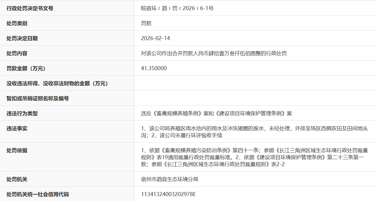 近日,据“信用安徽”公开披露行政处罚信息,因违规排放污水、未履行环评验收手续,泗县春益牧业发展有限责任公司被处以罚款41.35万元。行政处罚决定书文号是皖宿环﹝泗﹞罚﹝2026﹞6-1号。