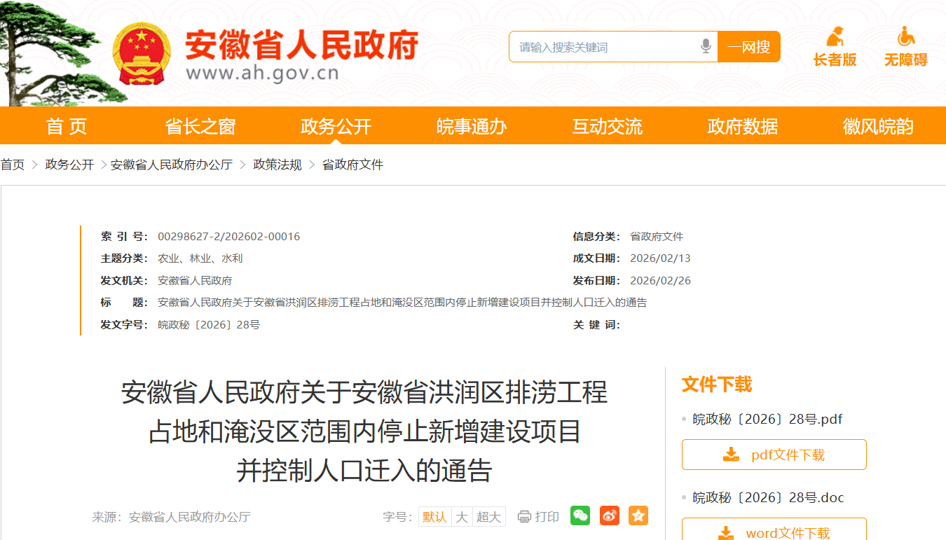 近日,安徽省人民政府发布关于安徽省洪润区排涝工程占地和淹没区范围内停止新增建设项目并控制人口迁入的通告。详情如下: