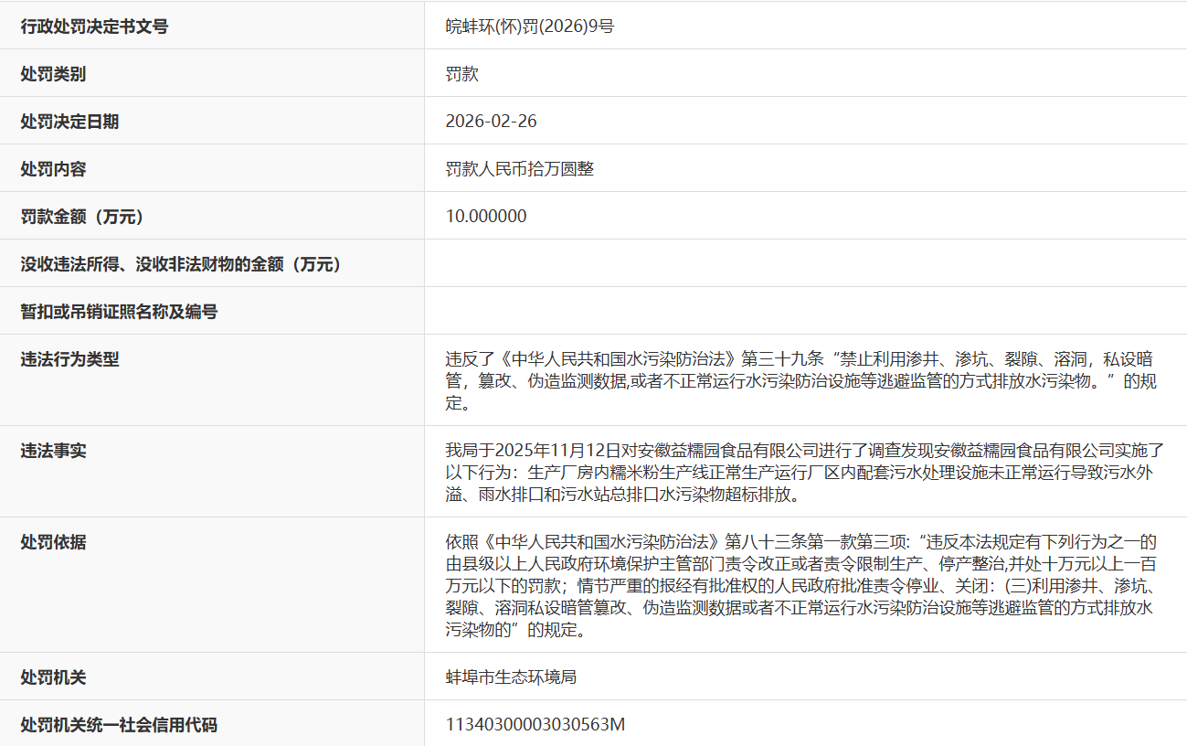 近日,据“信用安徽”公开披露行政处罚信息,因超标排放污染物,安徽益糯园食品有限公司被处以罚款10万元。行政处罚决定书文号是皖蚌环(怀)罚(2026)9号。