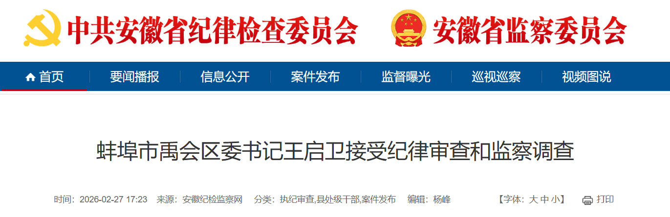 蚌埠市禹会区委书记王启卫涉嫌严重违纪违法,目前正接受安徽省纪委监委纪律审查和监察调查。(安徽省纪委监委)