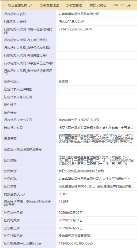 近日,据“安徽药监局”公开披露行政处罚信息,因在未经许可的场地生产第二类医疗器械医用热敷贴,安徽鑫露达医疗用品有限公司被处以罚款38.836万元,被没收违法所得、没收非法财物的金额为11.096万元。行政处罚决定书文号是皖药监械处罚〔2026〕3-4号。