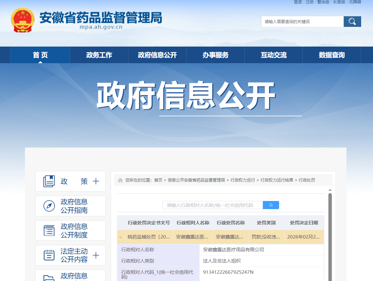 此前,在2025年12月22日,安徽鑫露达医疗用品有限公司因被抽检到不符合规定的产品,被处以罚款2万元。
