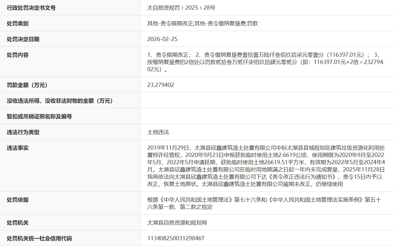 近日,据“信用安徽”公开披露行政处罚信息,太湖县欣鑫建筑渣土处置有限公司土地违法被处以罚款23.279402万元。行政处罚决定书文号是太自然资规罚﹝2025﹞28号。