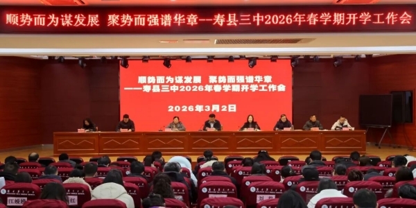 3月2日上午,寿县三中全体党政班子、教职工在学术报告厅召开2026年春学期开学工作会。会议全面总结过去一年办学成果,周密部署新学期重点工作,进一步统一思想、凝聚共识、压实责任,为新学期各项工作高质量开展奠定坚实基础。