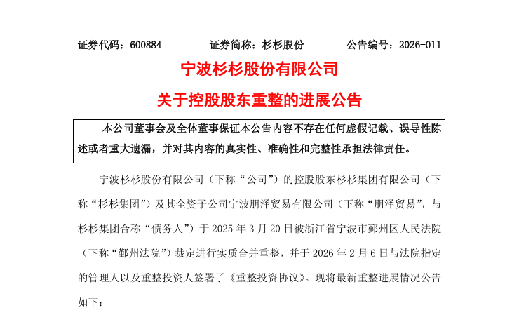 2026年3月3日,公司收到管理人的通知,管理人于2026年2月28日向债权人会议提交《杉杉集团有限公司和宁波朋泽贸易有限公司重整计划(草案)》(下称“《重整计划(草案)》”,其核心内容摘要详见附件);杉杉集团和朋泽贸易合并破产重整案第四次债权人会议于2026年3月2日15时召开,表决期截至2026年4月15日17时。