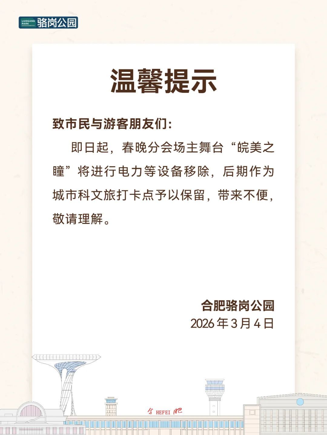 即日起,春晚分会场主舞台“皖美之瞳”将进行电力等设备移除,后期作为城市科文旅打卡点予以保留,带来不便,敬请理解。