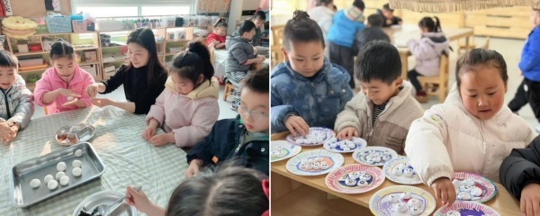 孩子们系上小围裙,洗净小手,有模有样地搓起了汤圆。揉一揉、搓一搓、捏一捏,白白胖胖的汤圆在掌心渐渐成形,每一个汤圆都包裹着孩子们对节日的期待。当热气腾腾的汤圆端上桌,大家品尝着自己的劳动成果,甜在嘴里,更暖在心里。在美工区内,孩子们用彩纸、黏土创作元宵主题作品。剪一剪、贴一贴、画一画,圆圆的汤圆、可爱的灯笼、热闹的团圆场景跃然纸上。一幅幅充满童趣的作品,是孩子们对传统节日最纯真的理解与表达。