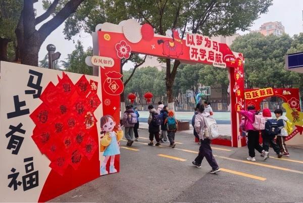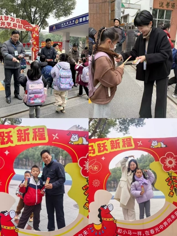 清晨,校园门口春意融融。四位校长早早守候在校门口,亲手为每一位进校的学生送上精心准备的新春祝福书签。书签上写满殷切寄语,承载着师长对孩子们新学期的美好期许。与此同时,各班学生代表将亲手书写的“福”字,郑重粘贴在“福马展板”上,一个个“福”字汇聚成班级的祝福,也象征着海棠学子在新的一年里福运绵长、逐梦前行。