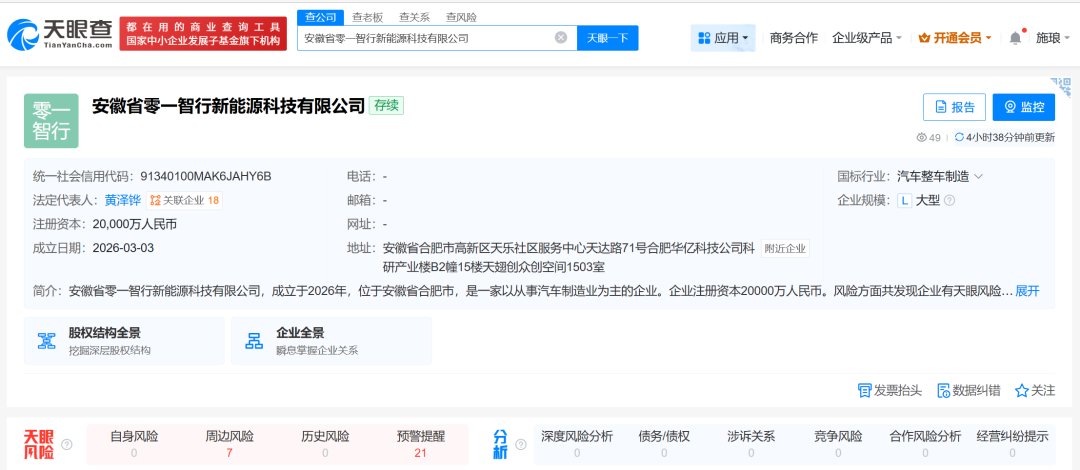 天眼查显示,3月3日,安徽省零一智行新能源科技有限公司成立,法定代表人为黄泽铧,注册资本2亿元,经营范围包括新能源汽车整车销售、电池制造、电动汽车充电基础设施运营、汽车零配件批发等。