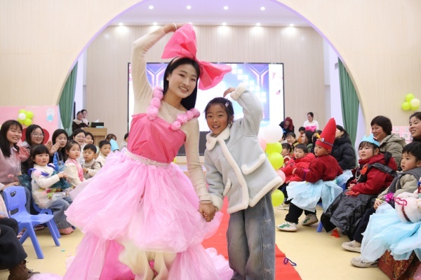 中班举办“惊蛰启春,为爱焕装”亲子环保时装秀。家长和幼儿利用卡纸、报纸等废旧材料,亲手设计制作环保时装。孩子们自信走上舞台展示风采,并在“大声说出你的爱”环节中,用真挚告白表达对长辈的爱意。活动将创意实践与情感表达相结合,让五育理念落地生根。