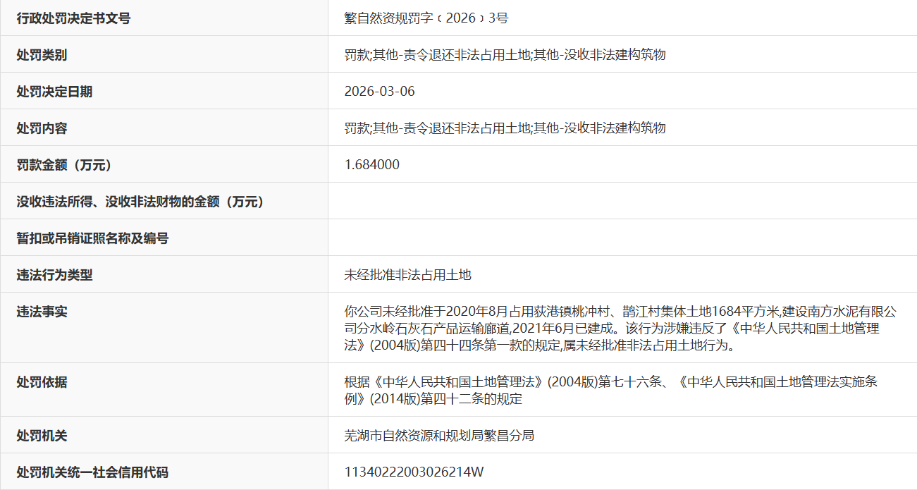 公开处罚信息显示,该公司未经批准于2020年8月占用荻港镇桃冲村、鹊江村集体土地1684平方米,建设南方水泥有限公司分水岭石灰石产品运输廊道,2021年6月已建成。该行为涉嫌违反了《中华人民共和国土地管理法》(2004版)第四十四条第一款的规定,属未经批准非法占用土地行为。