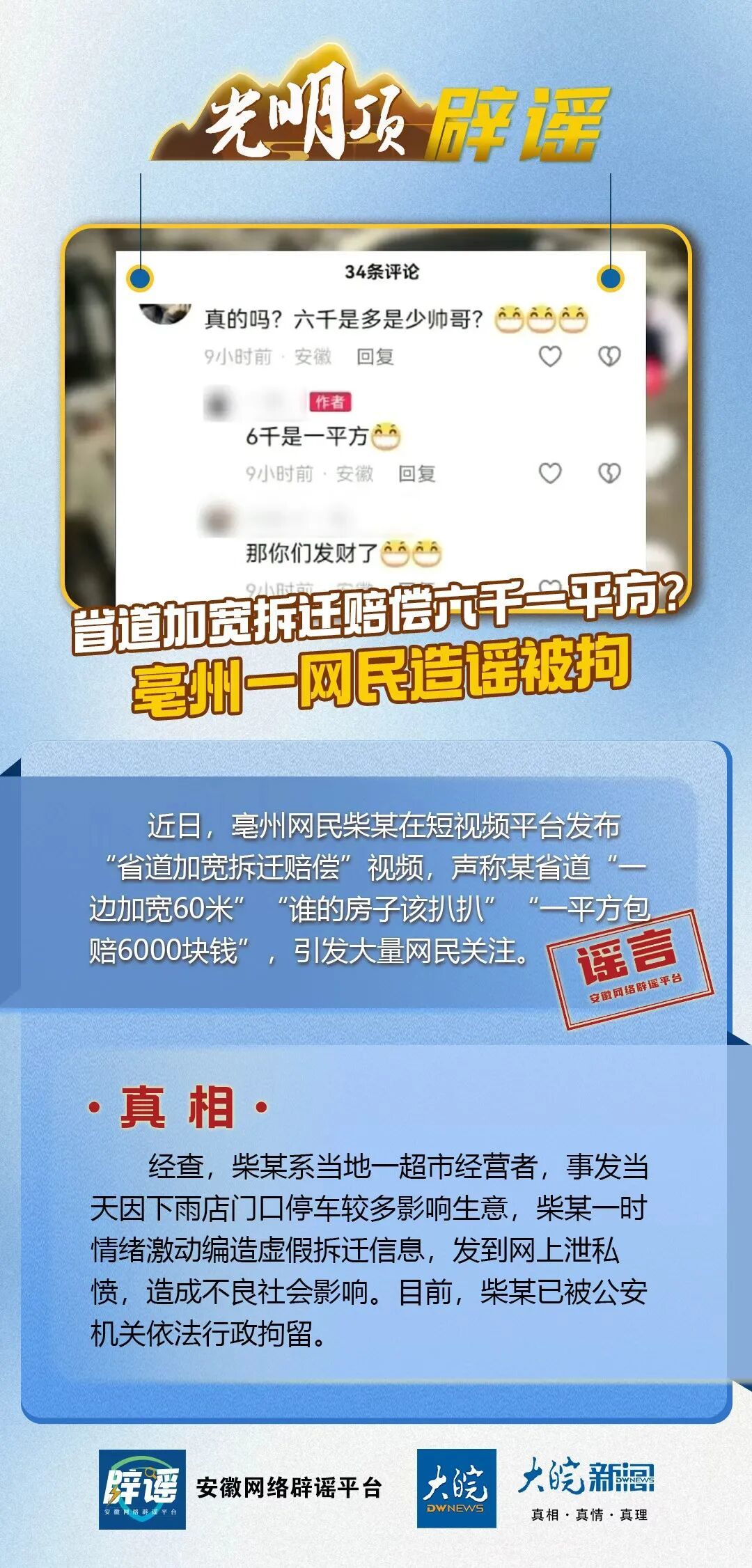 近日,亳州网友柴某在短视频平台发布“省道加宽拆迁赔偿”视频,声称某省道“一边加宽60米”“谁的房子该扒扒”“一平方包赔6000块钱”,引发大量网民关注。