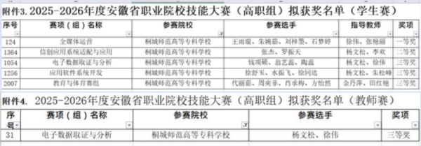 近日,2025-2026年度安徽省职业院校技能大赛(高职组)拟获奖名单公布,桐城师范高等专科学校参赛团队凭借扎实的专业功底与出色的临场表现,斩获一等奖1项、二等奖1项、三等奖4项,再创佳绩!