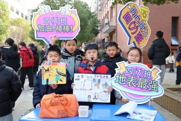 展评现场气氛热烈,创意无限。明皇大道及教学楼天井内,三至六年级推选出的优秀学生代表们带着精心筹备的作品闪亮登场。小展台上,一本本精美的实践作业展示册与环保创意作品令人目不暇接。小作者们戴着“小蜜蜂”扩音器化身“超级推销员”,声情并茂地向驻足观看的师生介绍创作过程与作业亮点,积极为自己亲手制作的个性投票箱拉票。全校师生手持“最喜爱的作品”选票穿梭于各展台间,根据个人喜好郑重地将票投给最打动人心的创意之作。