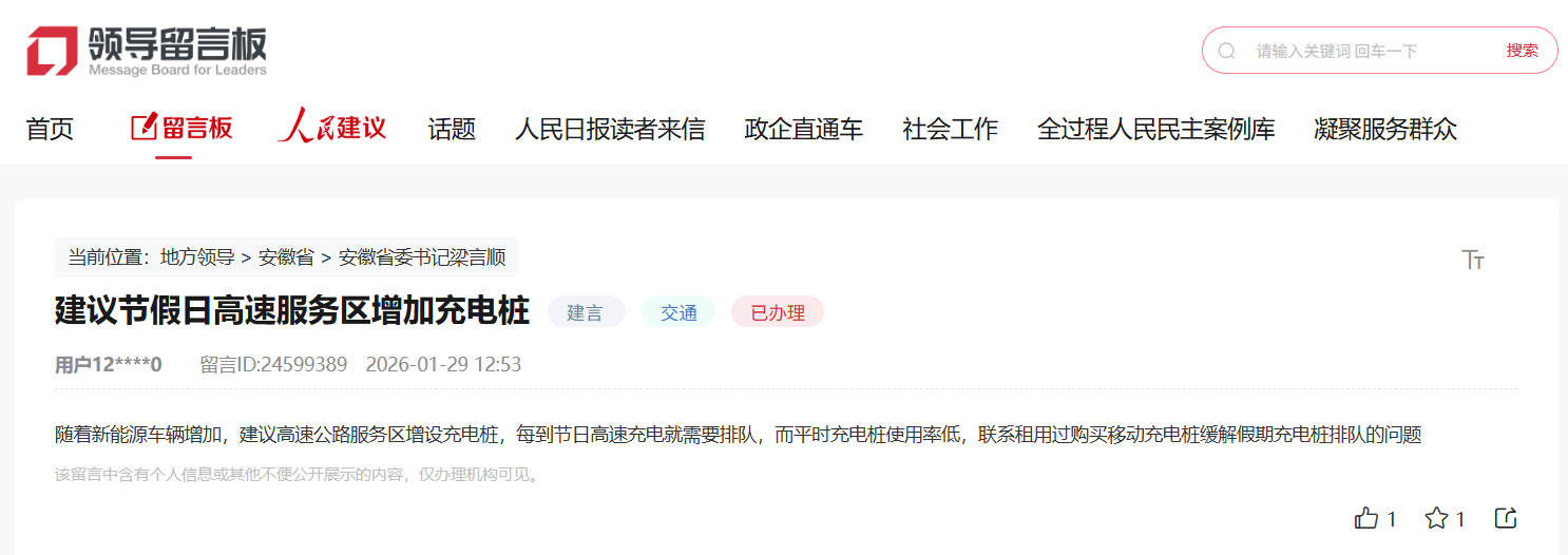 近日,有网友通过“领导留言板”建议节假日高速服务区增加充电桩。对此安徽省交通运输厅回复。