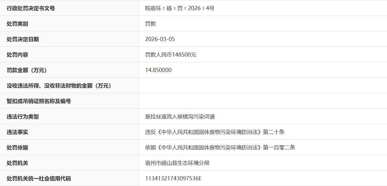 近日,据“信用安徽”公开披露行政处罚信息,因污染河道,安徽红润铜业有限公司被处以罚款14.85万元。行政处罚决定书文号是皖宿环﹝砀﹞罚﹝2026﹞4号。