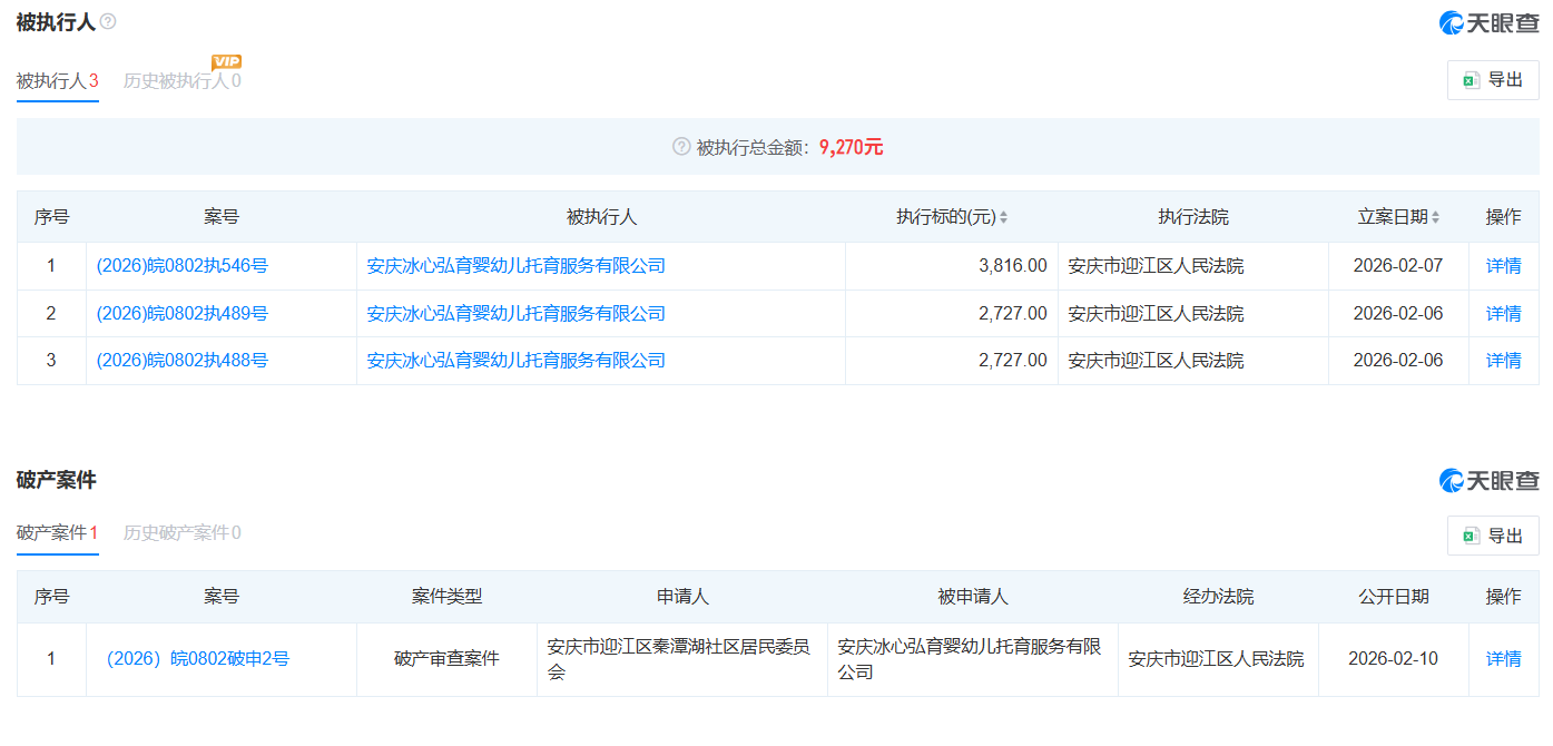 2026年2月,安庆冰心弘育婴幼儿托育服务有限公司新增3条被执行人信息,执行总金额9270元;同月,安庆市迎江区秦潭湖社区居民委员会申请对该公司进行破产审查,案件已由安庆市迎江区人民法院受理。