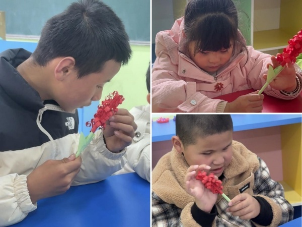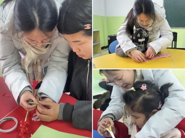 随后,吴瑶老师手把手地指导每一位孩子:从裁剪彩纸、卷曲花瓣,到粘贴花茎、装饰叶片,每一个步骤都耐心示范、细心辅助。孩子们专注地跟着老师的动作,用指尖感受纸张的变化,慢慢将一片片彩纸变成灵动的花朵。