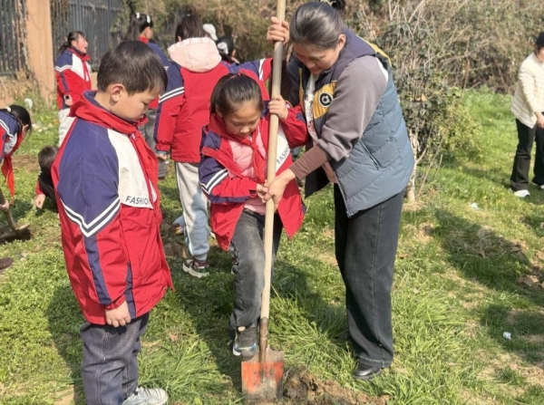 国际部校区3月8日上午,二(5)中队佩戴鲜艳红领巾,齐聚铁线公园旁开展“植一片新绿,护一方蓝天”主题植树活动,以实际行动播撒绿色希望。