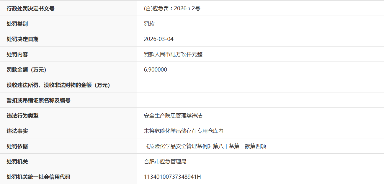 近日,据“信用安徽”公开披露行政处罚信息,因未将危险化学品储存在专用仓库内,安徽省庆云医药股份有限公司被处以罚款6.9万元。行政处罚决定书文号是(合)应急罚﹝2026﹞2号。