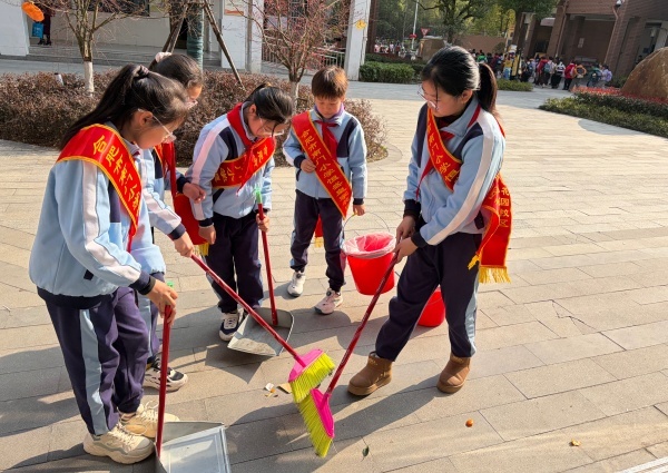 活动现场,队员们精神抖擞、热情高涨,在辅导员老师的统一安排下有序开展各项实践活动。队员们化身为“校园美容师”与“护绿小使者”,他们手持垃圾袋、夹子等工具,仔细清理绿化带中的纸屑、塑料袋、枯枝落叶等垃圾,不放过任何一个卫生死角。弯腰、捡拾、分类、装袋,每一个动作认真细致,原本整洁的校园环境在大家的努力下更显清新雅致。