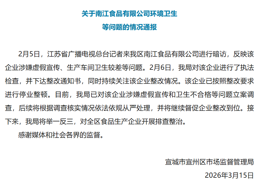 2月5日,江苏省广播电视总台记者来我区南江食品有限公司进行暗访,反映该企业涉嫌虚假宣传、生产车间卫生较差等问题。2月6日,我局对该企业进行了执法检查,并下达整改通知书,同时持续关注该企业整改情况。该企业已按照整改要求进行停业整顿。目前,我局已对该企业涉嫌虚假宣传和卫生不合格等问题立案调查,后续将根据调查核实情况依法依规从严处理,并将继续督促企业整改到位。接下来,我局将举一反三,对全区食品生产企业开展排查整治。